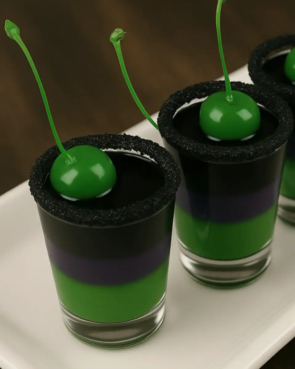 Bold color, layered texture, and instant Halloween drama—Frankenstein’s Lab Shots deliver it all with simple bar moves and easy-to-find ingredients. Chill your components, pour with control, and play with the purple density until your bands look laboratory-precise. Add a black-sugar rim, drop in a green cherry, and you’ve got a tray that screams spooky science—no lightning required.