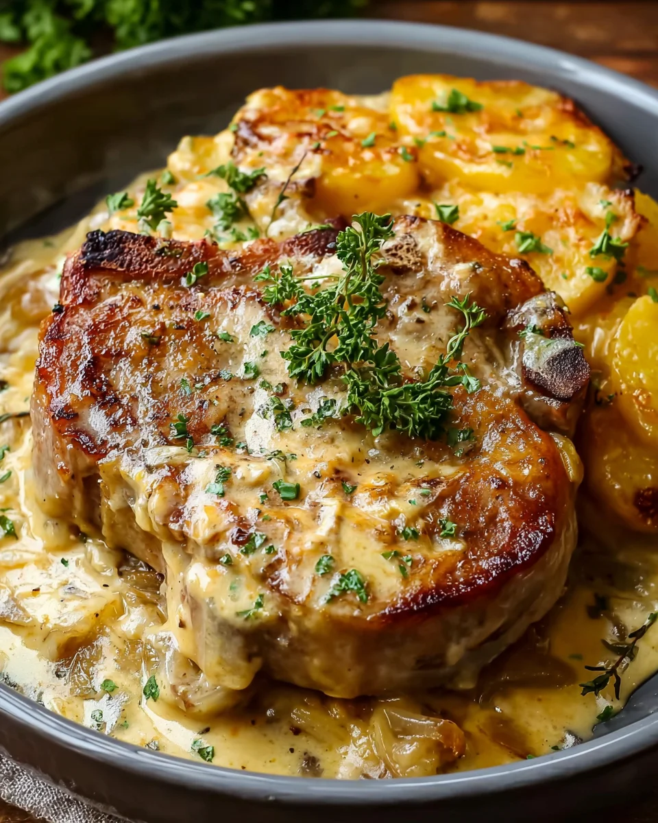 A delicious Smothered Pork Chop and Scalloped Potato Casserole that brings together tender pork chops and creamy scalloped potatoes.