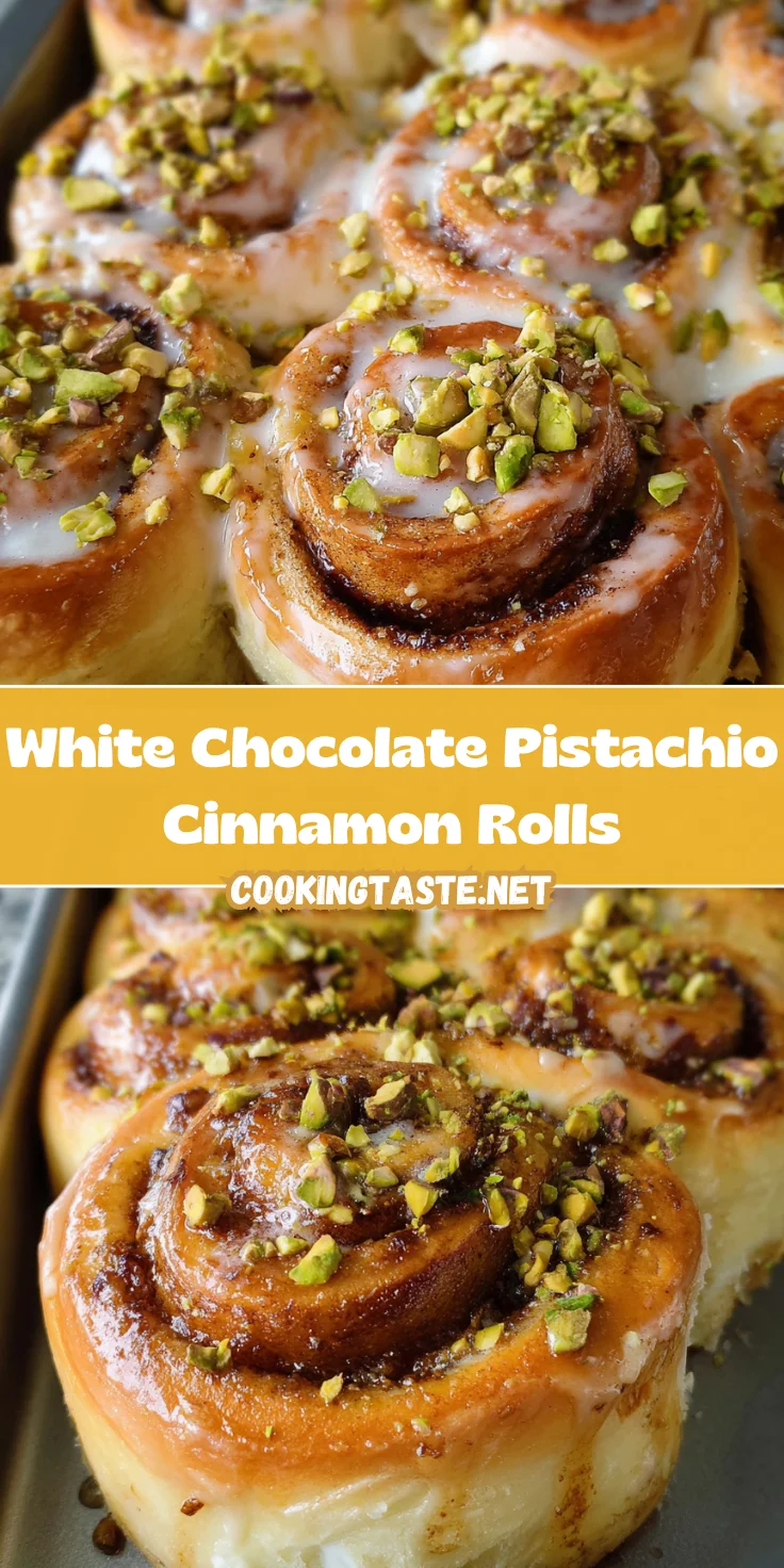 A delightful recipe for soft and fluffy cinnamon rolls filled with white chocolate, pistachios, and cinnamon, topped with a luscious white chocolate ganache.